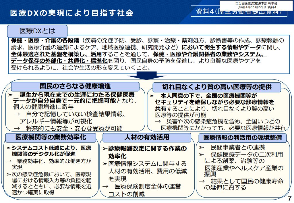 これらは少子高齢化による人手不足を最新のテクノロジー技術を使い解消につなげるだけでなく、国民にとっての最適な受療、そして医療機関に従事する関係者の業務負担軽減など、多角的な変革を実現するために行われています。