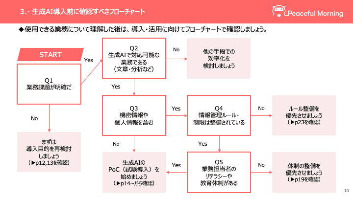 ・種類別AIのカオスマップ ・生成AI導入前に確認すべきフローチャート ・生成AI活用を広げるための体制づくり ・生成AIをビジネスで活用する上での注意点と解決策