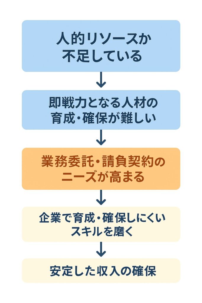 発注者側でも、業務に求められるスキルやノウハウを必要なときに活用できるメリットがある一方、業務委託と同様、社内にこれらが蓄積されにくいといったデメリットがあります。
