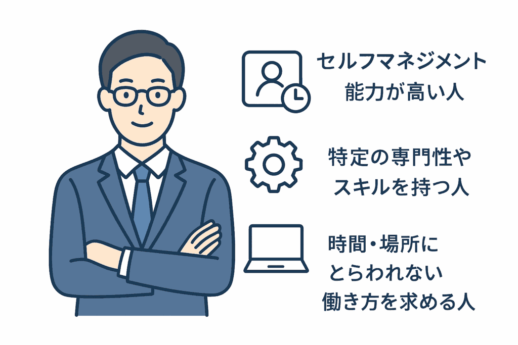 業務委託という働き方は、企業に属さない働き方であるために、向き・不向きがあります。特に、委任・準委任契約は、仕事の完成ではなく契約期間中の業務遂行に対して報酬が発生するため、セルフマネジメント能力を有する人や特定の専門性・スキルを持つ人、1つの拠点にとらわれない働き方を求める人に向いています。