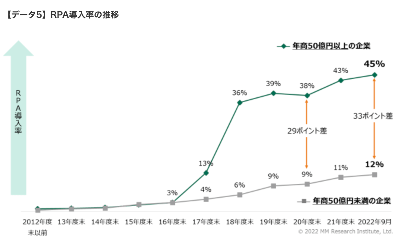 日本国内のRPA市場は、現在普及期にあると考えられます。 MM総研の調査によると、2022年のRPA導入率は、年商50億円以上の大企業で45%に達し、前年から2ポイント増加しました。 一方で、年商50億円未満の企業の導入率は12%にとどまっており、企業規模による導入状況の違いが見られます。