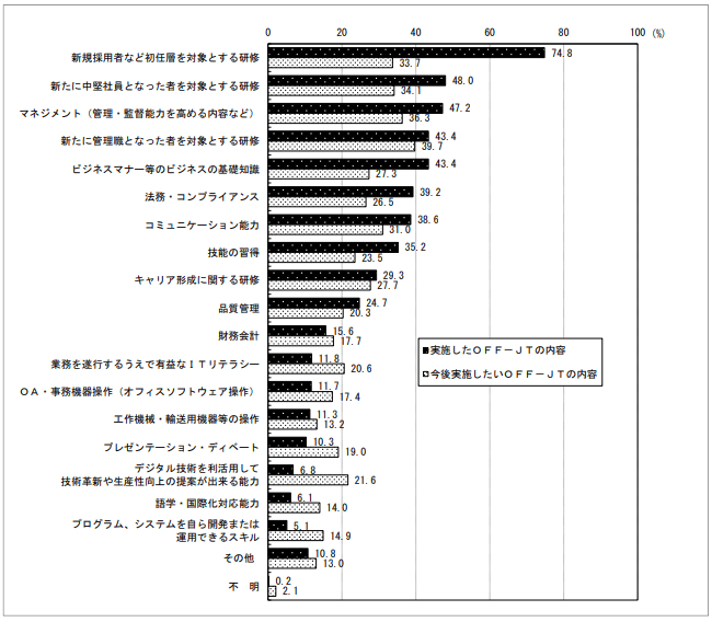 なお、厚生労働省の調査でも、上記のなかでも階層別研修がメインで行われていることが分かります。